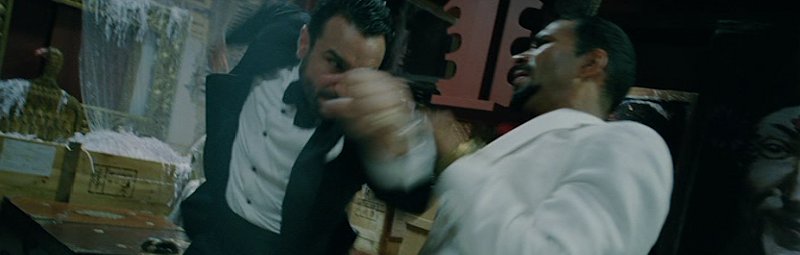 In einer Sequenz z.B. bei der ein Song drübergelegt wird, sehen wir wie Agent Vinod auf einer begrenzten Ebene von Zimmer zu Zimmer eilt, sich vor seinen Widersachern versteckt um sie dann blitzschnell auszuschalten. Ein Katz-und-Maus-Spiel, filmisch interessant auch deswegen, weil die Sequenz eine ununterbrochene 3 1/2-minütige Steadycamfahrt ist. Sie startet mit dem Blick auf eine blinde Klavierspielerin und endet mit dem Blick auf die Klavierspielerin. Ist zwar nicht ganz so cool wie eine ähnliche Szene im Thailand-Actioner „Tom yum goong“ aber die Idee ist gut (bei Khans Schusshaltung gibt es allerdings Abzüge!). Eine Tanzchoreographie sehen wir während eines Aufenthalts in einem Nachtclub – auch hier eliminiert Vinod wieder einige Gangster. Eine klassische Bollywood Song- & Dance-Nummer gönnt man uns aber doch und da wirft sich dann die weibliche Hauptdarstellerin des Films Kareena Kapoor (3 Idiots, Ra.One) in Schale. Im echten Leben Ehefrau von Hauptdarsteller Khan wird Kapoor in dieser Geschichte als Bombenlegerin Iram vorgestellt, die bei einem Kriminellen Unterschlupf gefunden hat, den Vinod im Visier hat. Kaum überraschend sind fortan die Wege der beiden oft identisch beim Versuch den Weg der Bombe zum Anschlagsort zu ermitteln.