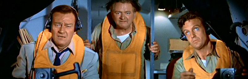 Die Passagiere sind ja brav, folgen den Anweisungen der einzigen Stewardess an Bord, werfen nach Aufforderung bereitwillig (!) all ihre Koffer aus dem Flugzeug als man wegen dem brennenden Triebwerk auch noch Sprit verliert. Zuviel unnötiges Gewicht muss man schließlich loswerden um die Hoffnung aufrechtzuerhalten es doch noch bis zur Küste zu schaffen ohne vorher ins Meer zu stürzen. Außerdem ist ja der „pfeifende Dan“ John Wayne an Bord, der erfahrene Co-Pilot, der seit über 30 Jahren fliegt und längst nicht zum alten Eisen zählt. Auch wenn uns dies das Getratsche der Landcrew schon zu Beginn des Films glauben machen will. Doch wenn man von John Wayne später geohrfeigt und als „Schlappschwanz“ tituliert wird sollte das alle Zweifel beseitigen, dass hier keiner sitzt der still auf die Pension wartet. In Wayne we trust. Für den Film gab es tatsächlich sechs Oscar-Nominierungen (u.a. beste Regie), den Goldjungen erhielt aber nur Komponist Dimitri Tiomkin, der zuvor schon für „Zwölf Uhr Mittags“ zweimal belohnt wurde.