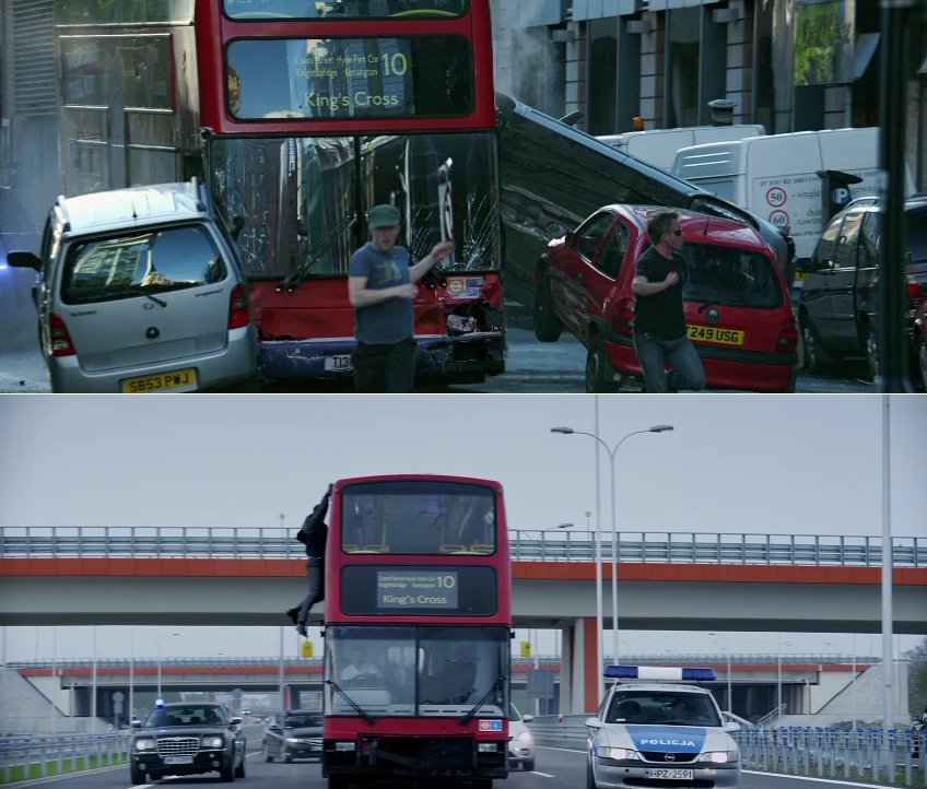 Regieneuling Sajid Nadiadwala, 48, bisher erfolgreich als Produzent und Drehbuchautor (u.a. Housefull 1+2) tätig, beginnt seine Geschichte in Warschau, Polen und lässt seine Protagonistin via Flashback von ihrer ersten großen Liebe in Indien erzählen. So stellt sich „Kick“ zunächst als überdrehte Liebeskomödie mit eingestreuten Actionszenen dar und wandelt sich in der zweiten Hälfte des Films zum Polizist-jagt-Dieb-Streifen à la „Dhoom“. Eine Spannung wird dadurch aber nicht erzeugt, denn Salman Khan ist eben der unschlagbare, gerissene Räuber, der seinem Verfolger auf der Nase herumtanzt, stets mit einem Grinsen im Gesicht. Ganz auf die Hauptattraktion, seinen männlichen Star fokussiert, gelingt es Nadiadwala in diesem Remake eines Telugu-Films von 2009 nicht eine logisch nachvollziehbare Geschichte zu erzählen. Hauptsache der Star sieht immer cool aus, egal was er tut. Eine groß angelegten Actionszene mit einem englischen Doppeldeckerbus (Fahrziel King's Cross, 10; deutlich zu lesen!) hat man in London und Warschau gedreht. Normalerweise sollte man das ja in der Postproduktion so verschleiern, dass der Zuschauer es nicht merkt. In diesem Film hat das wohl niemanden gekümmert. So gibt es also eine Verfolgungsjagd mit englischen und polnischen Polizeifahrzeugen und viele zerstörte englische und polnische PKW (s. Bild). Der Deutsche Stefan Richter (TVs Alarm für Cobra 11 – Die Autobahnpolizei), der schon bei „Don 2“ die Berliner Action koordinierte, sorgte dafür, dass auch in Polens Hauptstadt ordentlich Gas gegeben wurde.