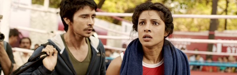 Dass Indiens Filmindustrie mehr kann als die Welt mit bunten Herz-Schmerz-Komödien zu beglücken sollte sich mittlerweile herumgesprochen haben. Auch wenn nicht gesungen und getanzt wird kann das heimische Mainstream-Publikum erreicht werden. Z.B. mit interessanten Biographien über indische Sportler wie in „Paan Singh Tomar“ (2010) und „Bhaag Milkha Bhaag“ (2013). Auch „Mary Kom“ war ein Hit, was vor allem natürlich der starken Präsenz der populären Hauptdarstellerin zu verdanken ist. Priyanka Chopra hat in den letzten Jahren in leicht verdaulichen Blockbustern an der Seite von Superstars wie Shahrukh Khan (Don 2) und Hrithik Roshan (Krrish 3) agiert aber auch immer wieder ihr schauspielerisches Talent in weniger kommerziellen Streifen wie in „Kaminey“ oder „7 Khoon Maaf“ demonstriert. In der schrägen Romcom „Anjaana Anjaani“ schließt sie einen Selbstmordpakt mit Ranbir Kapoor und mit dem selben Co-Star harmoniert sie auch in der wunderbaren Tragikomödie „Barfi!“. Für die Rolle der Boxerin musste sie sich körperlich gut vorbereiten (Muskelmasse aufbauen, Boxtechniken lernen etc.), denn schließlich sind die obligatorischen Szenen des Trainings (gerne auch Rocky-Style in der Natur) und die Ausscheidungskämpfe bei nationalen und internationalen Wettbewerben unverzichtbar. Für die Boxchoreographie griff man auf Rob Miller zurück, der schon in verschiedenen indischen Filmen mit sportlichem Inhalt sein Know-How verbreitete (Chak de India!, Dil Bole Hadippa, Bhaag Milkha Bhaag). Beim Dreh boxte Chopra übrigens gegen echte Boxerinnen.