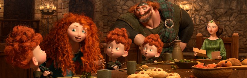 Hier geht es aber um Merida, das Mädchen mit Pfeil und Bogen, mit feuerrotem Haar, das keine Haube bändigen kann – sie soll verheiratetet werden. Das widerspricht ihrer Sehnsucht nach Freiheit und Selbstbestimmung. Die potentiellen Kandidaten finden es wiederum ärgerlich, dass sie extra mit ihren Clans angereist sind und nun mit leeren Händen nach Hause segeln sollen. Soweit so gut, noch Zünden die Gags. Und wenn alle feiern passiert schon irgend was. Dann kommt das große Zerwürfnis zwischen Tochter und Mutter (Vater hält sich raus) und der heimliche Gang zur Zauberin, die dafür sorgen soll, dass die Mutter nicht mehr nervt, sorgt für Unheil. Pixar bindet uns jetzt einen großen Bären auf und langweilt den Zuschauer mit einer Familie-muss-doch-zusammenhalten-Geschichte, bei der jeder seine Fehler eingestehen muss, Verständnis für den anderen aufbringen soll etc. Ist jetzt thematisch kein Neuland für Pixar, riecht aber noch strenger nach Disney und ist von diesem Produktionshaus auch schon besser erzählt worden. Im Original vertraut man bei der Stimmenwahl auf Schotten und Engländer (u.a. Kelly Macdonald, Billy Connolly, Emma Thompson) was auch Sinn macht, spielt die Handlung doch in den Hochebenen Schottlands. In der Synchronisation fällt dieser reizvolle Aspekt des lokalen Dialekts weg. Stattdessen müssen wir uns mit Nora Tschirner in der Titelrolle abfinden.
