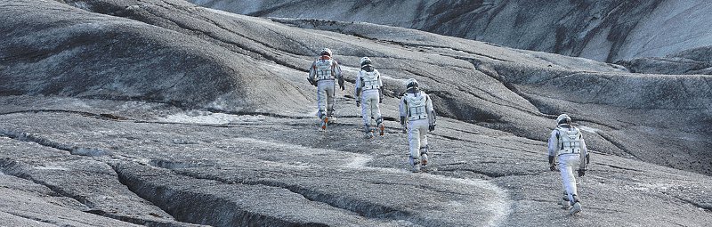 Matthew McConaughey (True Detective) sei die reibungslose Rückkehr in die Mainstream-Heldenrolle gegönnt und als verwitweter Familienvater Cooper bringt er das größte Opfer überhaupt. Er lässt seine minderjährigen Kinder bei Opa auf der Erde zurück ohne die Gewissheit zu haben sie jemals wiederzusehen. Die eindringlichste und berührendste Sequenz im ganzen Film ist dann auch die in der dem Protagonisten und dem Zuschauer das Vergehen der Zeit vor Augen geführt wird. Während für Cooper auf der einen Seite des Wurmlochs in einer anderen Galaxie die Zeit langsam vergeht rast sie auf der Erde. So können Ausflüge auf einen potentiell geeigneten neuen Planeten für die Astronauten nur ein paar Stunden dauern, auf der Erde sind dann aber bereits viele Jahre vergangen. Cooper erhält also Videobotschaften und erlebt sehr emotional das Heranwachsen seiner Kinder und Enkel quasi im Zeitraffer. Klar, dass er so schnell wie möglich zurück zur Erde will und dabei auch mit seiner kleinen Crew, darunter Kollegin Brand (Anne Hathaway, The Dark Knight Rises), aneinandergerät, die eigene Wünsche hat. So actionreich wie Nolans letzte Filme geht es hier aber bei weitem nicht zu und Geduld muss man auch mitbringen um sich zwischen Wissenschaftstalk und dem bedingungslosen Überlebenswillen der Protagonisten in die Story hineinzufinden. Schöne Locations, besonders hervorzuheben dabei die Kargheit Islands, helfen dabei. Auch eine gute Besetzung in den Nebenrollen mit Michael Caine (Batman Begins) als Professor, Jessica Chastain (Das Verschwinden der Eleanor Rigby) als die wütend forschende Schwester Coopers oder Matt Damon (Promised Land) als einsamer, am Leben hängender Astronaut, hält bei Laune.